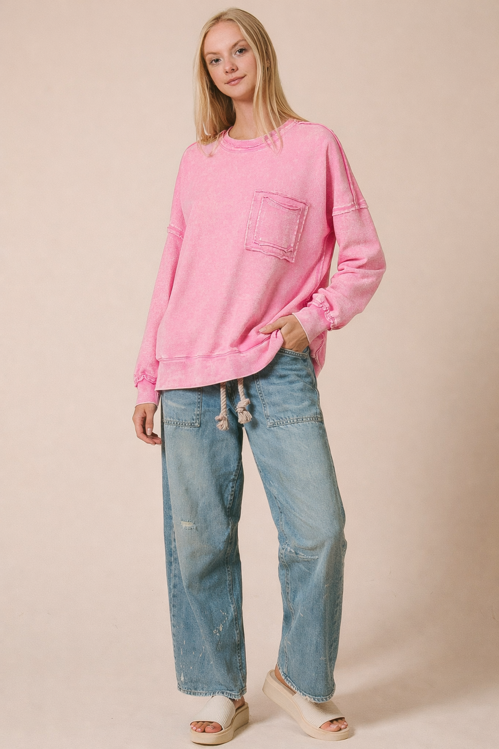 Cozy and cute French terry acid wash raw edge front pocket pullover with pockets 👌🏻